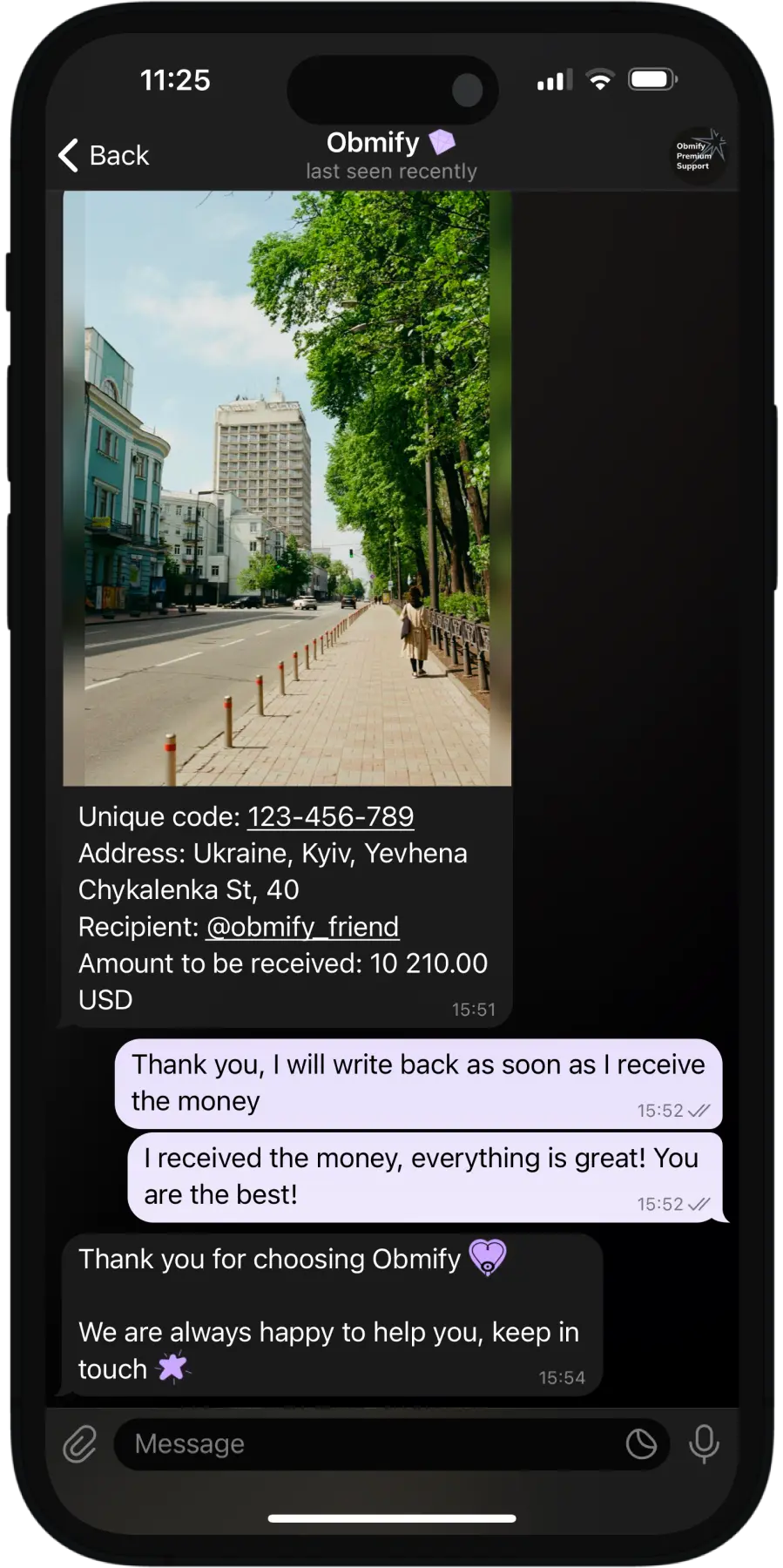 Premium Support de Obmify ofrece un método seguro para el intercambio de criptomonedas, garantizando transparencia en las transacciones y protección de fondos. Un gerente que genera confianza supervisa cada transacción. Incluso en la etapa de listado, verificamos cada contraparte, el monto de los fondos y la ausencia de tarifas ocultas no incluidas en la tasa de cambio. Toda la información que ves en nuestra plataforma es precisa y sin sorpresas.